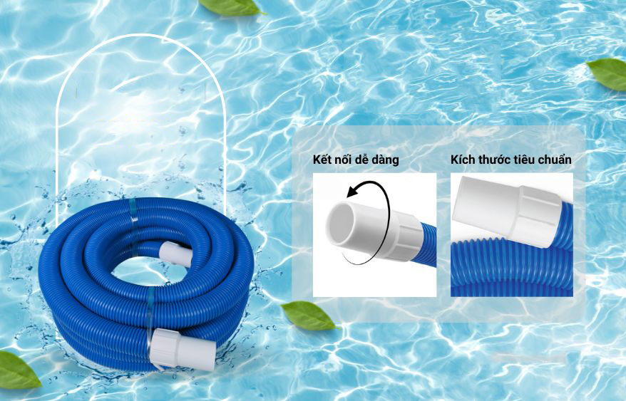 - Ống mềm được cấu tạo 2 đầu, 1 đầu gắn với bàn hút, 1 đầu gắn với đầu hút vệ sinh hồ bơi.